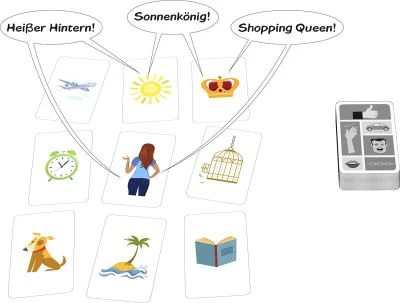Neun Karten und jede Menge Raum für Kreativität! Aus zwei der Karten muss eine Kombination gebildet werden. Sprichwörter, Zitate, Filme, Musiktitel oder auch ein Hauptwort – alles ist erlaubt, Hauptsache kreativ! Auf gehts! Wer ruft als Erstes die beste Idee rein und gewinnt die Karten?