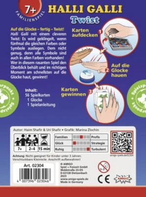 Auf die Glocke, fertig, Twist! Diese Halli Galli-Variante bringt einen cleveren Twist ins Spiel: Wurde beim Klassiker des Spiels noch bei fünf gleichen Früchten geklingelt, wird bei Halli Galli Twist geklingelt, wenn fünfmal die gleiche Farbe oder fünfmal das gleiche Symbol ausliegt. Nur bei Halli Galli Twist gibt es jedes der vier Symbole auch in allen vier Farben! Halli Galli Twist ergänzt die Halli Galli-Reihe des Autors Haim Shafir um ein weiteres actiongeladenes Reaktionsspiel.