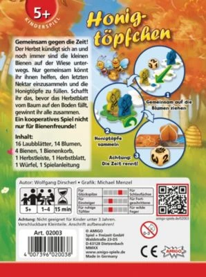 Inhalt: 16 Laubblätter, 14 Blumen, 4 Bienen, 1 Bienenkorb, 1 Herbstleiste, 1 Herbstblatt, 1 Würfel, 1 Spielanleitung