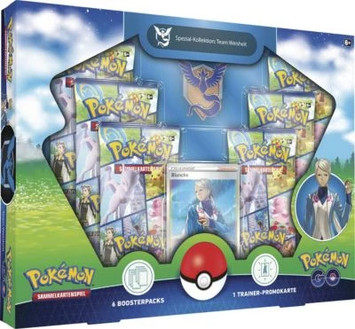 Für alle Teamleiter kommt mit dieser coolen Pokémon GO Spezial Kollektion DE von Amigo ein cooler und hochwertig gestalteter Pin, mit dem auf den ersten Blick klar wird für welches Team gespielt wird: Team Intuition, Team Weisheit oder Team Wagemut. Außerdem sind in dem Set eine holografische Vollbild-Promokarte mit Spark, Blanche oder Candela und 6 Boosterpacks aus der besonderen Erweiterung Pokémon GO. Neuer Spiele- und Sammelspaß für alle Pokémon-Fans.