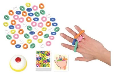 Alle Spieler versuchen so schnell wie möglich, sich die auf den Karten abgebildete Kombination von Haargummis über die Finger zu streifen.