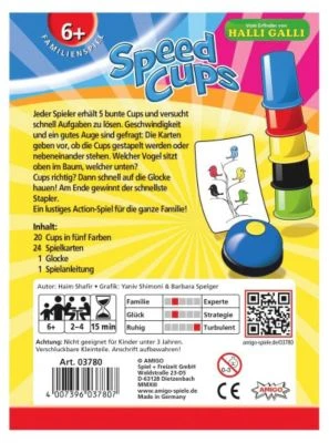 Bei diesem Spiel sind ein gutes Auge, Reaktionsvermögen sowie Geschwindigkeit gefragt: Jeder Spieler erhält 5 bunte Cups und versucht in möglichst kurzer Zeit die auf den Karten vorgegebenen Aufgaben zu lösen.