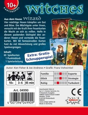 Bei dem Stichspiel Witches aus der erfolgreichen Wizard-Reihe gilt es, die roten Feuerkarten der bösen Feuerhexe zu vermeiden. Mit etwas Glück helfen die anderen Hexenkarten dabei, das gefährliche Feuer zu neutralisieren, sie können aber auch zusätzliche Minuspunkte einbringen. Manchmal kann nur noch ein Zauberer aus höchster Not retten.